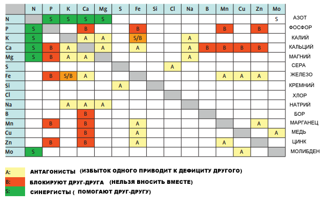 Помимо азота, растения в саду и огороде нуждаются и в прочих макро- и микроэлементах. Правильно подобрать их вам поможет эта таблица, учитывающая взаимодействие веществ друг с другом