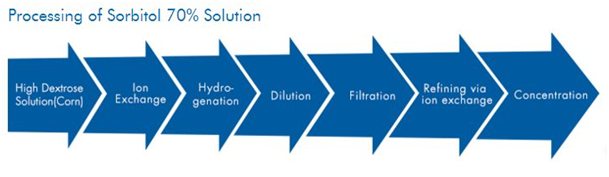 Порошок сорбита получают путем каталитического гидрирования D-глюкозы и доступны в виде свободнотекучего кристаллического порошка и в виде водных растворов.