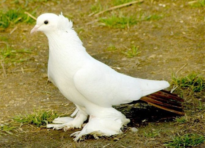 Глаза — чёрные; веко белое, нежное, шириной 1-2 мм. Клюв — белый, длинный (23-25 мм, измеряя от угла рта до конца клюва), Шея — средней длины, постепенно утолщается к груди, без крутого изгиба. Грудь — широкая, слегка выпуклая. Спина — в плечах широкая, длинная, слегка спадающая к хвосту; корпус удлинённый, слегка покатый, пропорционален росту. Крылья — длинные, плотно прижатые, лежат на хвосте. При сомкнутом крыле выступают 10-е и 9-е перья над спиной. Хвост — сомкнутый, нормальной ширины, состоит из 12-16 широких перьев тёмно-жёлтого или чёрного цвета. Ноги — плотно оперённые густыми и длинными (более 100 мм) перьями, расположенными тарелкой, имеют «штаны», длинные перья на бёдрах (ястребиные перья). Перьевое украшение — чуб высокий, густой, развёрнутый «от уха до уха» (раковинообразный), переходит в гриву. Качество пера плотное, густое с блестящим оттенком. Стержни тонкие, упругие, блестящие, с широким опахалом. Цвет и оттенок — цветное оперение хвоста должно быть сочное и блестящее, тёмно-жёлтое, тёмно-красное или чёрное. Рисунок — голова, шея, корпус и оперение ног чисто белые.Хвост, надхвостье, репица и подхвостье тёмно-жёлтого, тёмно-красного или чёрного цвета. Лёт — выход в столб, после чего следуют резкие кувырки до 5-10 раз подряд, с характерными щелчками боем. Каждый выход в столб голуби делают индивидуально или из стаи несколько штук, один перед другим.