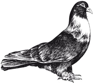 при таком положении 10-е, 9-е и 8-е перья первого порядка выступают над корпусом. Хвост плотно сомкнутый, состоит из 12 широких рулевых перьев. Ноги плотно оперенные, в виде колокольчика, перья длиной 2–4 см, пальцы красные, когти белые. Если есть чуб, то он должен быть раковинообразный, развернутый от уха до уха, высокий и густой с переходом в гриву. Оперение плотное, густое, с блестящим отливом, на щитках окаймление перьев более блестящее, это придает вид чешуйчатости.