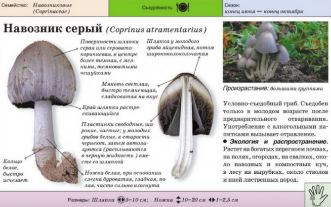 Серый навозник относится к роду Навозник семейства Навозниковые. Представителей этого вида часто называют чернильными грибами, или чернильными навозниками. Определение «чернильный» возникло неслучайно – у спелого навозника шляпка преобразуется в чернильную массу, распространяя таким образом споры.