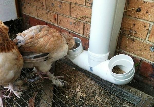Часто в хозяйстве после проведения ремонта сантехнических приборов остаются куски пластикового профиля. Если дома их нет, то в магазине их продают не так и дорого. Необходимо соединить трубы с помощью переходника, к которому нужно подсоединить два полуотвода. Соединив две конструкции, прикрепляют их к стене. Если поголовье цыплят большое, необязательно делать несколько кормушек. К тройнику подсоединяют трубы подлиннее и делают несколько отверстий, чтобы обеспечить доступ к корму.