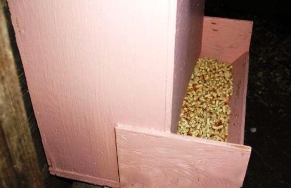 - корм в приготовленной самостоятельно кормушке должен подаваться дозированно. Птица не должна иметь возможности забраться в емкость. Отверстие для еды должно быть такого размера, чтобы в него проходила только голова птицы;