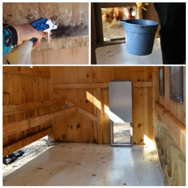 Все имеющиеся поверхности — стены, полы, потолок, насесты и прочее отмываются горячей водой. Для большего эффекта и чтобы удалить неприятный запах, в воду добавляют немного уксуса. Побеленные известью стены и потолок отмываются от неё полностью, поскольку слой своё уже отслужил. После всех проведённых процедур можно побелить заново.