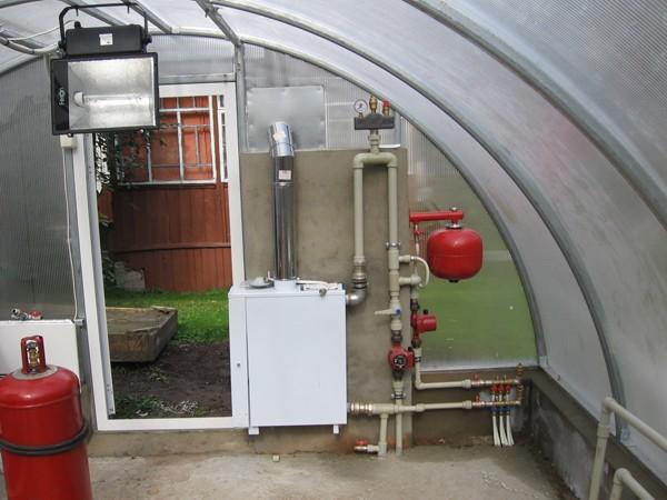 Если поликарбонатная теплица расположена рядом с домом, где есть централизованное или автономное водяное отопление, то можно подключиться к нему. Если такой возможности нет – используется котел, который работает на твердом топливе, газе или от электричества.