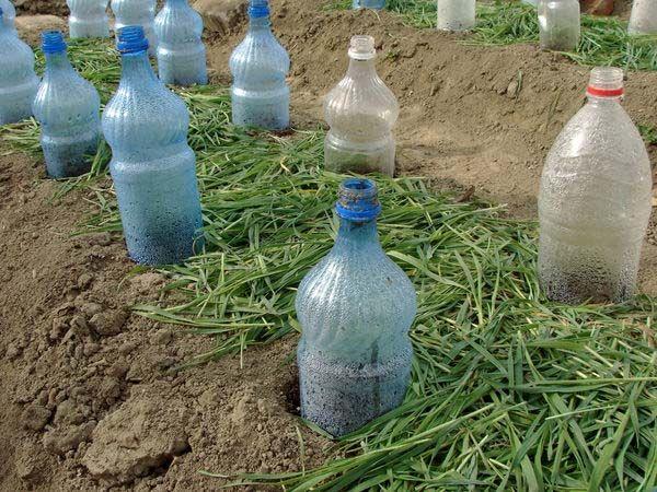 - Для обогрева теплицы из поликарбоната в ночное время подойдет следующий способ. По периметру вертикально закапывают бутылки с водой и оставляют их открытыми. В дневное время вода будет поглощать солнечное тепло, а в ночное отдавать его грунту. Водные испарения также создадут благоприятный микроклимат в помещении.