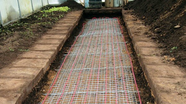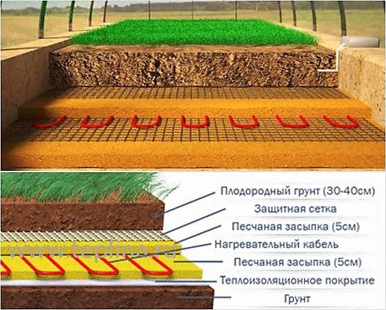 Он тоже работает от электричества и полностью покрывает основание теплицы. Вам нужно снять землю, положить изоляционный материал и кабель, затем снова насыпать грядки – и отопление готово.