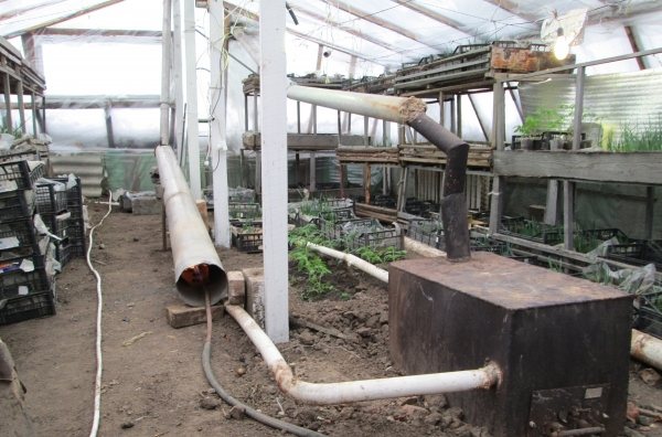 Такая конструкция ставится, как правило, в северной части сооружения или в тамбуре. Отопление всего пространства осуществляется благодаря естественной конвекции или воздухоотводам, которые прокладываются вдоль грядок. Отапливается печка по вечерам, а также днем, если сильно снижается уличная температура воздуха.