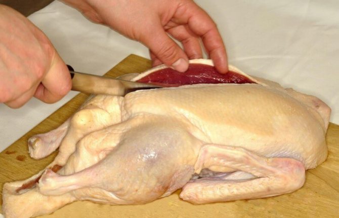 Прежде, чем разделывать тушку, ее стоит выпотрошить. В брюшке при помощи острого ножа делают продольный надрез и вынимают все внутренности (потроха). Это является первоочередной мерой, если человек планирует поместить птицу на некоторое время в холодильник. Выпотрошенные легкие, желудочек, печень не стоит выбрасывать, их применяют для приготовления первых блюд.