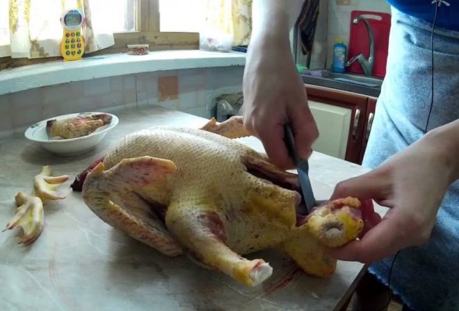 - перед тем, как распотрошить, на тушке отрезают шею;