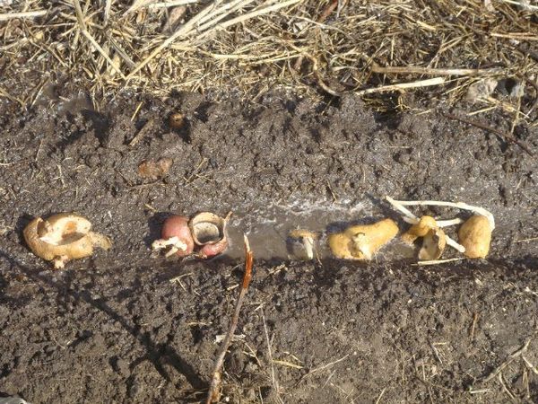 - далее, выложите в вырытую канавку свежие картофельные очистки слоем в 5 см, предварительно промытые в слабом растворе марганцовки;