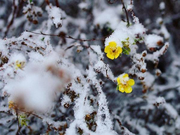 Несмотря на то что лапчатка кустарниковая сорта Голдфингер неприхотлива в выращивании и уходе, не стоит забывать про минимальные агротехнические нормы. Таким образом, на практике кустарниковая лапчатка устойчива к температурным колебаниям, в результате чего укрытий на зиму не требуется. В данном случае не требуется выкапывать культуру и переносить ее в теплицу, использовать специальные укрытия и создавать условия для зимовки. Лапчатку кустарниковую Голдфингер оставляют в зимний период времени на улице без каких-либо изменений.