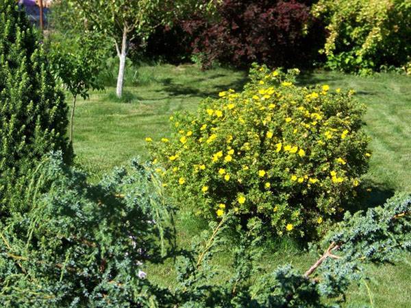Интересными будут комбинации кустов лапчатки с такими растениями, как: