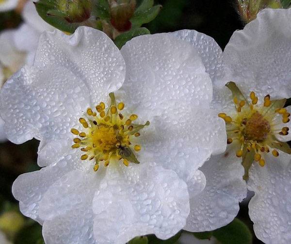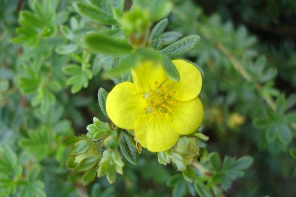 Бутоны лапчатки кустарниковой имеют простую форму и достигают 3,5 см в диаметре. Состоят из 5 округлых лепестков, которые окружают пушистый центр, состоящий из 30 нежных тычинок.