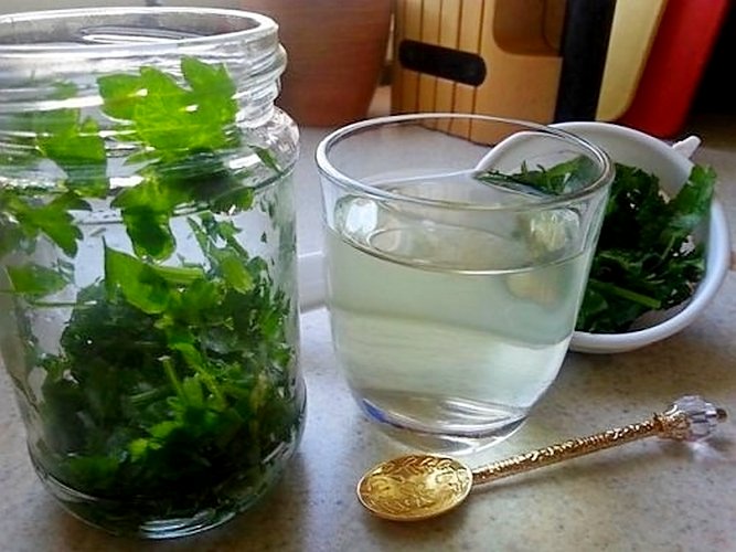 Пучок зелени петрушки (50 г) измельчите, поместите в эмалированную посуду и залейте стаканом (250 мг) кипятка. Поставьте на огонь, вскипятите. Накройте крышкой и томите на медленном огне 2 мин. Затем жидкость нужно остудить, процедить, а сырьё отжать.