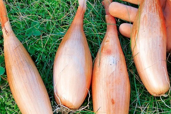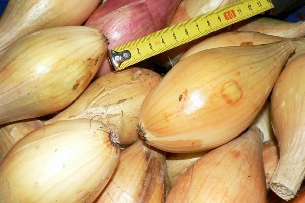 Луковицы бамбергера имеют округло-продолговатую форму. Длина головки достигает 10 см, а средний вес – 80 г. Белая сочная мякоть покрыта желто-коричневой кожурой. За форму луковиц, удобную при нарезке и отличные вкусовые качества ,амбергер ценится хозяйками.