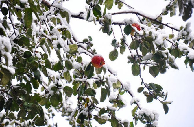 Эта процедура поможет яблоне перенести морозы. Если много снега, то присыпьте им деревца. Поскольку на ветках остается лист, то снять укрытие нужно сразу после установления положительных температур, чтобы почки не загнили.