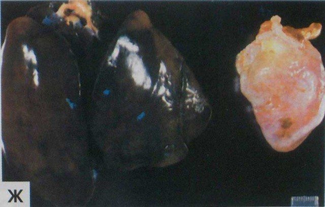 В дополнение к аэросаккулиту, который может распространяться на прилегающие ткани, часто присутствуют пневмония, плевропневмония, перикардит и перигепатит (фото). Реже можно наблюдать сальпингит, панофтальмит, инфекционное поражение костей и синовиальных оболочек, в основном после развития сепсиса. Воспаление воздушных мешков обнаруживается в основном на 4-9 неделе жизни бройлерных цыплят. Значительные экономические потери приносят широкое распространение заболевания, смертность и выбраковка тушек после обработки.