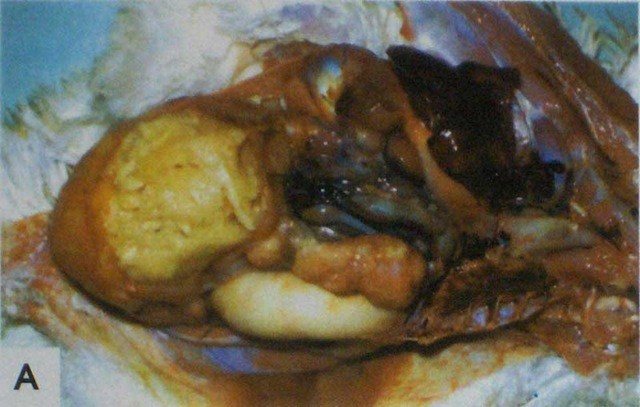 Перитонит. Инфицирование Е. coli перитонеальной полости происходит у кур-несушек, когда бактерии, поднявшись по яйцеводу, быстро размножаются в желтке, депонированном в брюшной полости. Оно характеризуется высокой смертностью, выделением фибрина и свободным желтком.