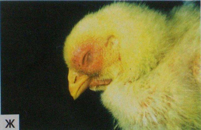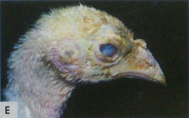 Синдром «вздутой головы» (СВГ) является острой или подострой формой целлюлита (воспаления соединительной ткани), в который вовлечены окологлазничные и смежные подкожные ткани головы птицы (фото). Воспаление окологлазничных тканей развивается уже на ранних стадиях болезни, а пораженная лимфоидная ткань в бронхах становится областью, через которые Е. соli проникает в слизистую оболочку.