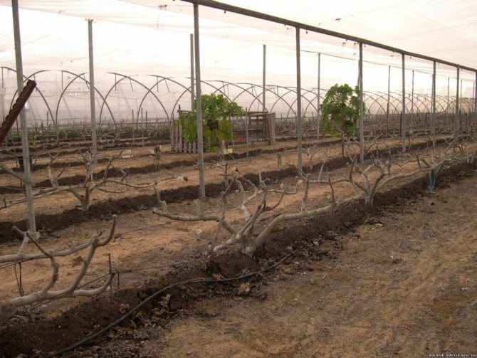 Прием посадки в траншею дает возможность обеспечить нормальный рост растения и формирования его в виде многолетнего куста. Для посадки отрывается траншея глубиной 1-1,2 метра. Стенки траншеи делаются разного наклона: северная крутая с углом наклона 85-90 градусов, южная до 30 градусов. Связано это с тем, что весной при такой крутизне стенок траншеи грунт лучше прогревается.