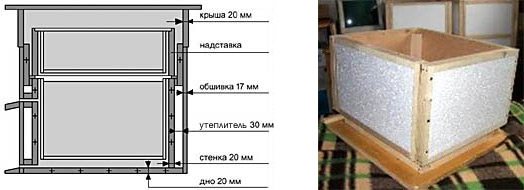 Пенолон выпускается листами толщиной до 12 мм, поэтому для утепления улья понадобится несколько его слоев. Утеплять улей по всей поверхности, превращая его в термос, не надо: для нормальной зимовки пчелосемьи необходим некоторый теплообмен пространства улья с окружающей средой. Схема и способ утепления фанерного улья показаны на рис.