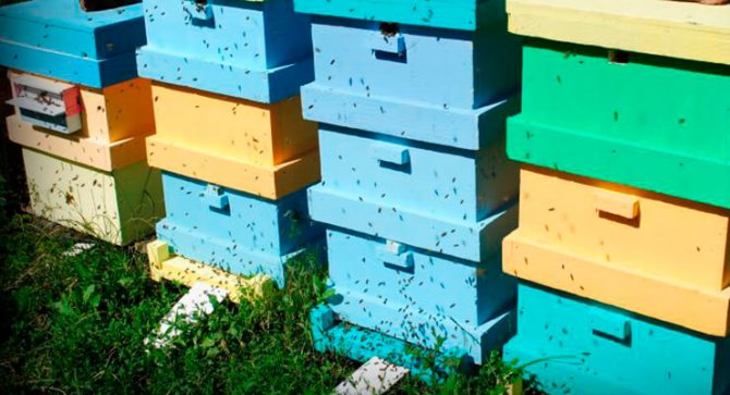 Наружная обработка улья для пчел должна предусматривать не только декоративную окраску, но и обязательную двухразовую обработку олифой, обеспечивающей стойкость дерева перед воздействием влаги, перепадов температур и проникновением вредителей. Окраску рекомендуют проводить краской белого, желтого или голубого оттенка, хорошо воспринимаемого насекомыми. Крышку улья полезно покрыть металлом, причем на кромках листы подвертывают так, чтобы защитить места срезов и торцы.