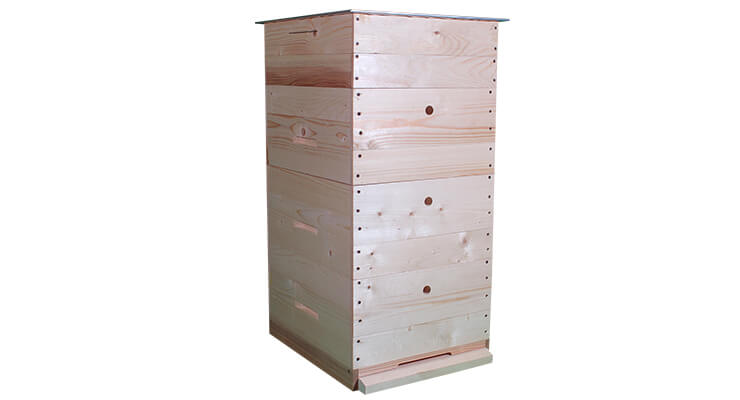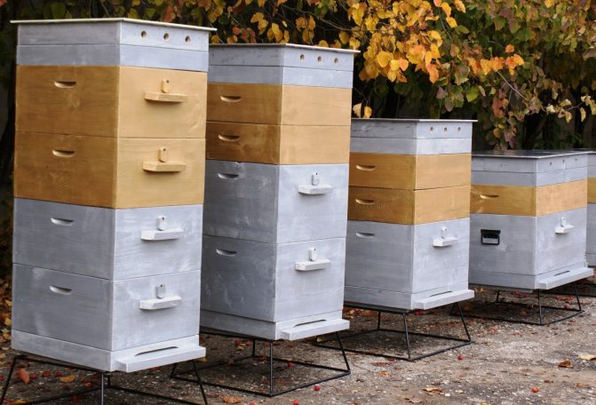 - Небольшие квадратные корпуса (длина внутренней стороны 30 см) с высотой 21,5 см (у расплодных – 10,5 см), каждый на 8 рамочек, выстраиваются один над другим;