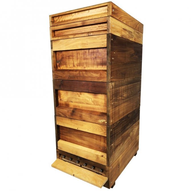 Классический вариант для изготовления ульев для пчел. В таких домиках пчелки чувствуют себя в естественных условиях, приближенных к природным. Лучшей породой дерева для изготовления будет кедр, хотя можно и липу, осину. Такие ульи лучше дышат, приятно пахнут и они сухие.