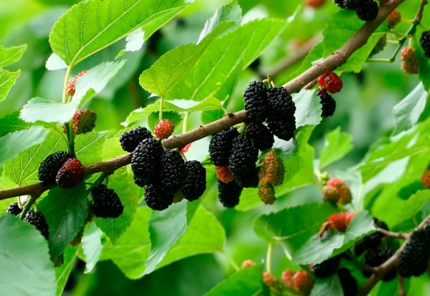 Большинтсво садоводов знает, как выглядит и цветет шелковица. Растение успешно выращивают даже в Подмосковье, где климат нестабильный. Насаждение легко переносит не только морозы, но и засуху. При минимальных стараниях можно получить достаточно урожая.