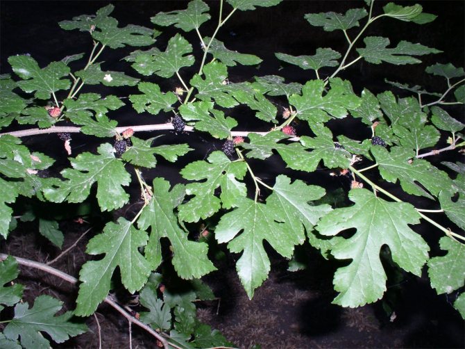 У настоящей шелковицы чёрной крупные листья широкосердцевидной формы