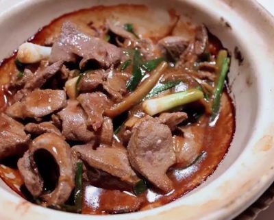 - Лук пошинковать, обжарить, положить кусочки субпродукта, посолить, поперчить. Тушить 10 мин. Налить соевый соус, положить давленный чеснок, тушить еще 5 мин.