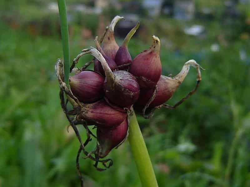 Таким образом, на одном растении может сформироваться в среднем до четырех уровней. Воздушные луковицы, весящие около полутора граммов, букетом висят на соцветиях, образуя на каждом от трех до тридцати таких головок. Плоды покрыты и прочной кожурой.
