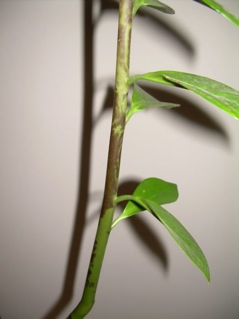 - Черные пятна на стволиках – следствие перелива или это свидетельствуют о том, что часть корешков погибла. Нужно организовать правильный уход за замиокулькасом.