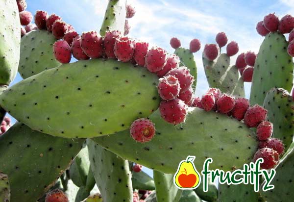 Плоды растут по краям плоских листьев-ладошек, обладают грушевидной формой. В среднем их размер составляет 7 см, оттенок кожуры варьируется от бледно-желтого до темно-красного. Цвет мякоти зависит от сорта опунции, она может быть белой, зеленой, красной, фиолетовой или желтоватой. Мякоть содержит по 3 маленьких семечки диаметром в 2-3 мм.