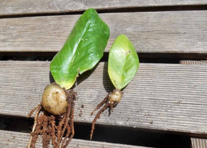 В случае повреждения оболочки корня клубня, рекомендуется немного подсушить его на воздухе. После этого, места среза обрабатывают древесным углем или легким раствором марганца. В результате такого метода, каждое новое растение имеет определенное количество клубней, которые быстро восстанавливаются через небольшой промежуток времени. Поливать новые растения рекомендуется через 2 дня с момента посадки.