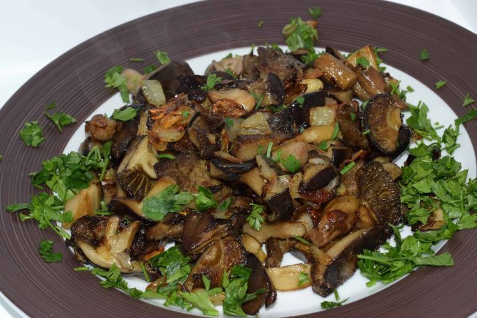 - Грибы положить в другую сковороду и тушить, пока не выпарится весь сок от зеленушек.