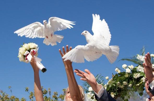 - Перед тем, как выпустить птиц, невеста и жених загадывают желание, которое скоро сбудется, если голуби взлетают вверх.